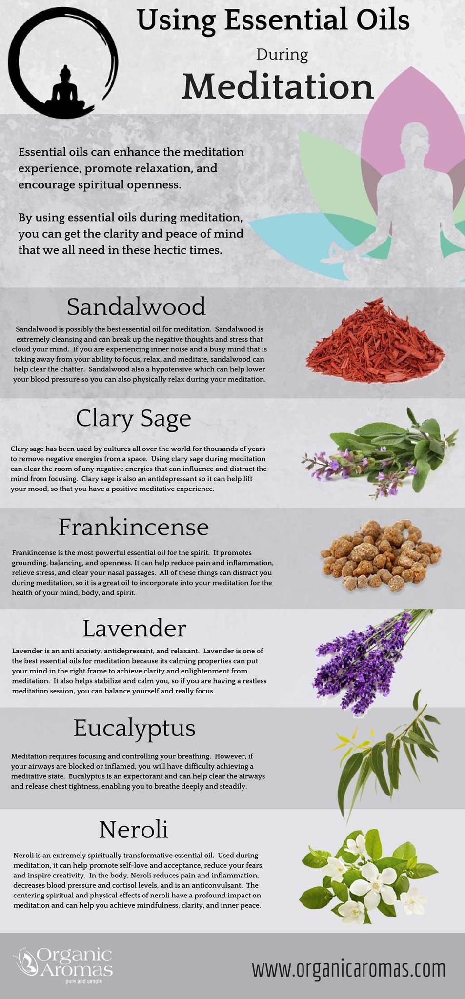 Sandalwood is possibly the best essential oil for meditation. It is extremely cleansing and can break up the most negative energy, thoughts and stress that cloud your mind. It is also a hypotensive which can help lower your blood pressure so you can also physically relax during your meditation.